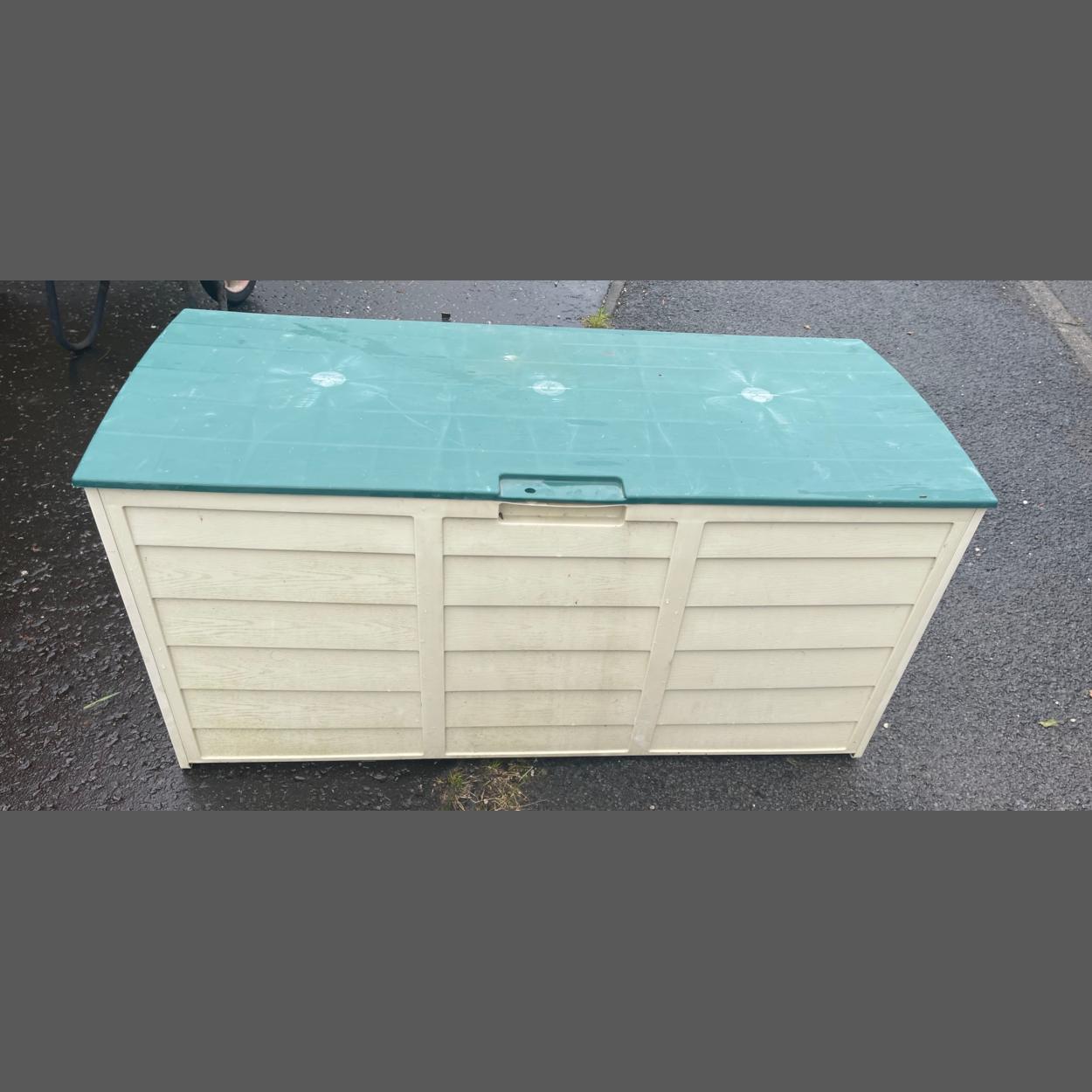 A HANDY and ROBUST outdoor resin garden storage bin with green lid - 4ft wide x 18" depth x 2ft height approx