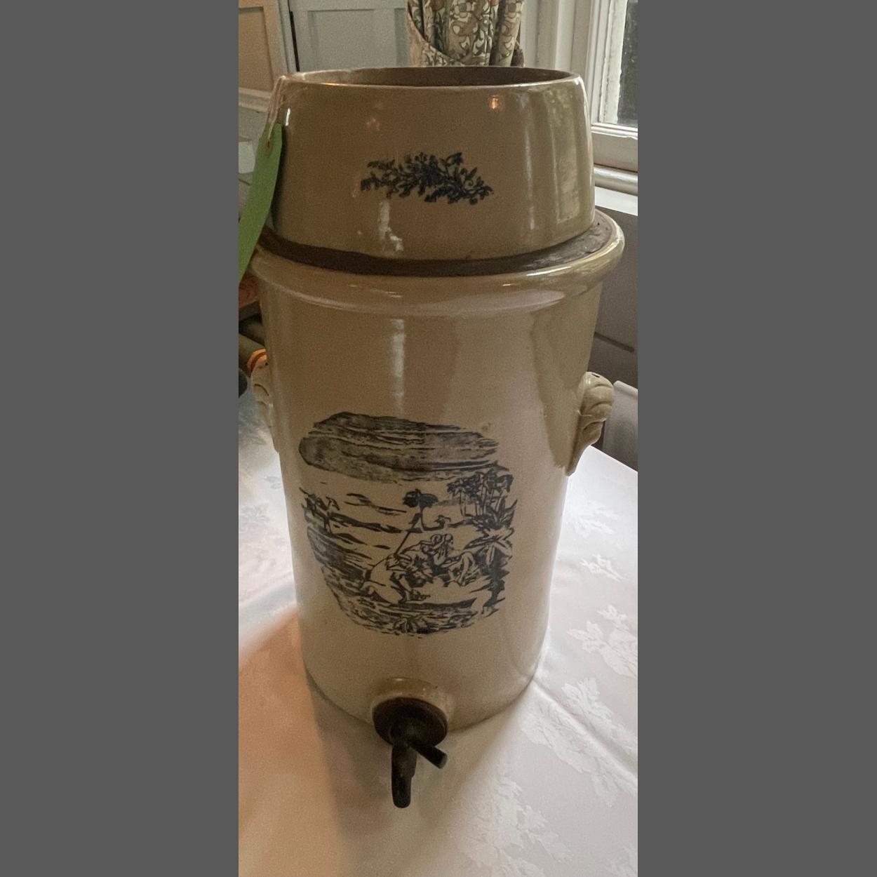 An ANTIQUE large glazed pottery container with tap - for pouring and storing beer - came from an old INN - with pirate scenes featured - stands 2ft tall approx