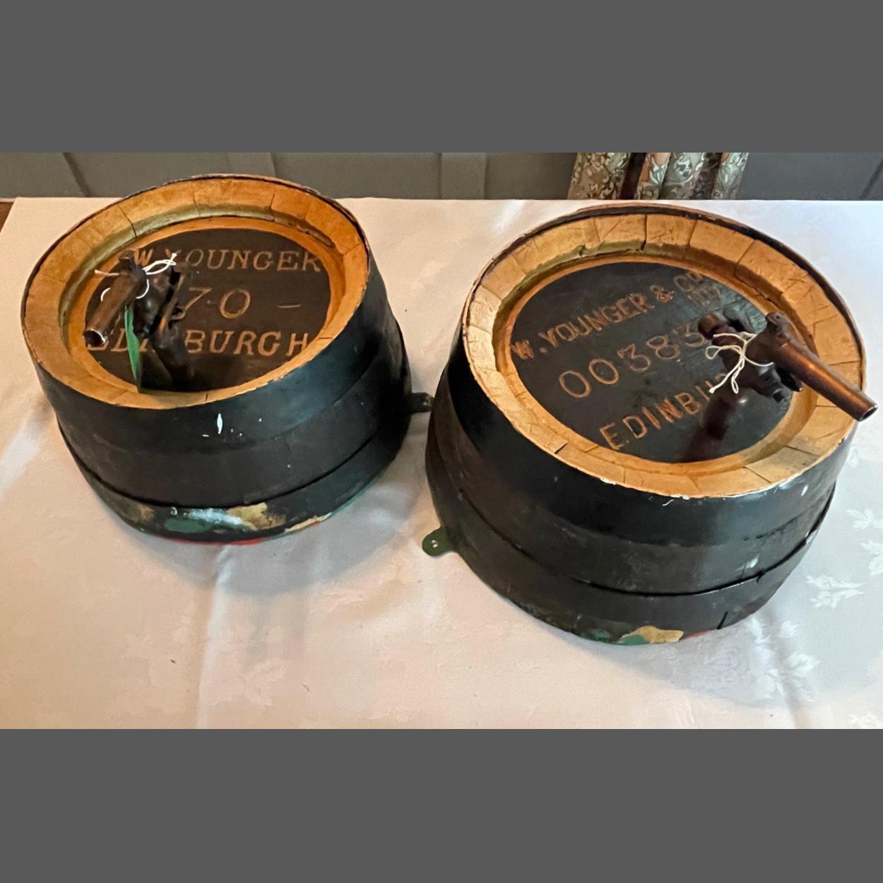 Collectible W YOUNGER & Co EDINBURGH pair of half cut wall hanging-vintage barrels - really impressive! - dimensions 30cm wide x 27cm depth