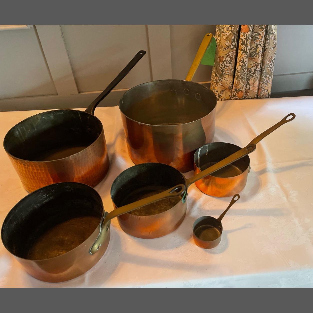ANTIQUE - A set of six copper and brass fittings/handled pans (one handle is iron) - biggest pan diameter 26cm approx - these pans came from an old Inn!