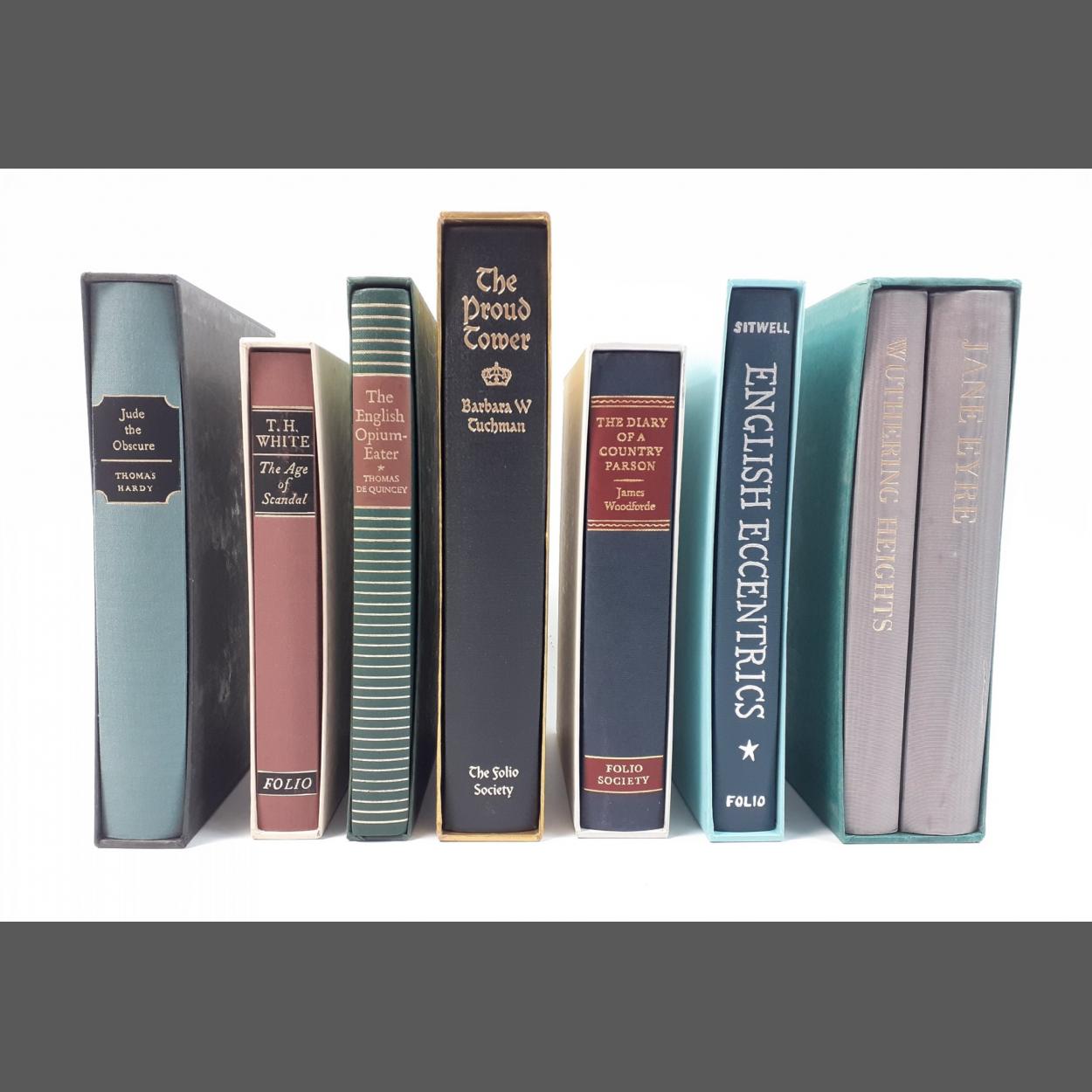 THE FOLIO SOCIETY - quality produced books to include CHARLOTTE AND EMILY BRONTË Jane Eyre and Wuthering Heights, (fifth printing 1995), with green silk binding (some fading to spines), JUDE THE OBSCURE by Thomas Hardy (pub 1992) in cloth binding with woodcut illustrations by Peter Reddick, ENGLISH ECCENTRIC by Edith Sitwell (pub.1994) illustrations by Roland Pym, with card binding), THE DIARY OF A COUNTRY PARSON by James Woodforde (second printing 1993) with marbled card binding and cloth spine, THE PROUD TOWER by Barbara W Tuchman, THE ENGLISH OPIUM EATER by Thomas de Quincey (reissued 1992). All in excellent condition and a great opportunity to own books made from top quality ingredients.