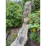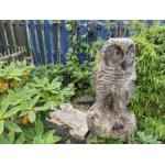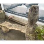 A FABULOUS FOREST handcarved TWIT-TWOO OWL garden bench seat for two adults - stands 4ft approx tall with a thick forest wooden plank and part of a tree stump plank support. - dimensions 4ft width approx - this item is approx 6 years old and simply a WORK OF ART! and would make a talking point feature in your garden!
