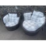 A PAIR OF OVERSIZED HALF BARREL garden seats - one will require a new roundel inner seat - both seats are ROBUST - there are loose cushions supplied which are not waterproof - OH LAZY SUMMER DAYS - the perfect 'sit-oot-erie solution! - 3ft diameter approx