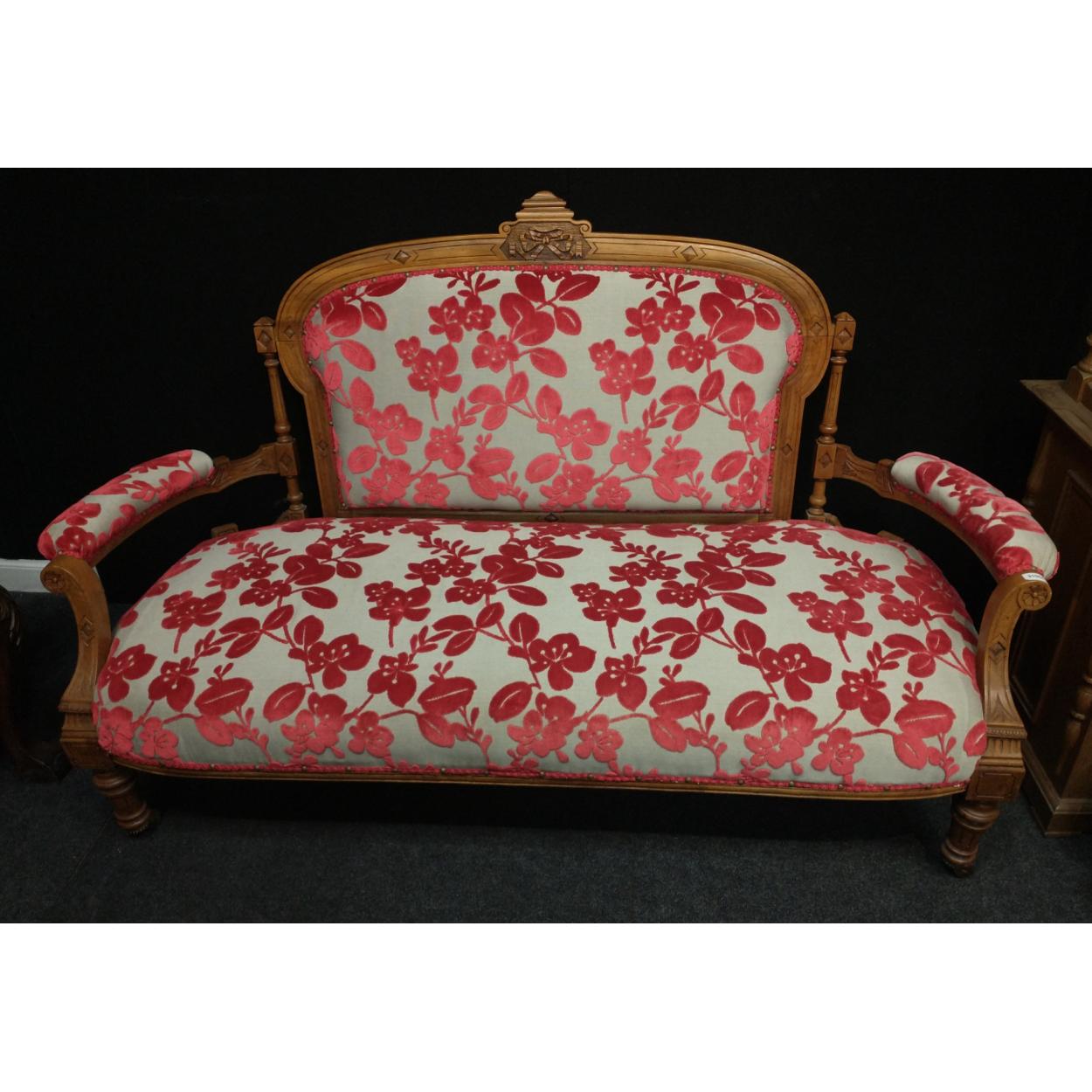 A nice EDWARDIAN parlour couch with oak frame which has just been newly re-covered in a striking red fabric - complete with original porcelain castors - 6ft width aporox