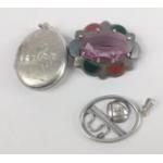 Three silver marked items, to include a nice Scottish hard stone, a centre pink stone, a Mackintosh rose style pendant and a locket with full (rubbed) hallmarks.