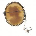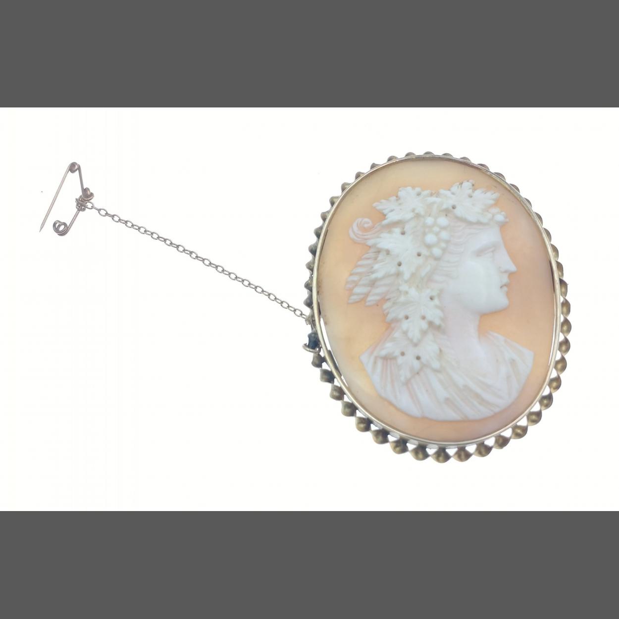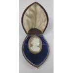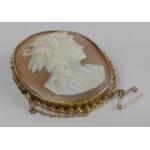 A yellow metal cameo brooch stamped 14k within a Victorian horse's hoof shaped box, 55mm long