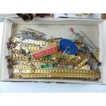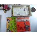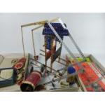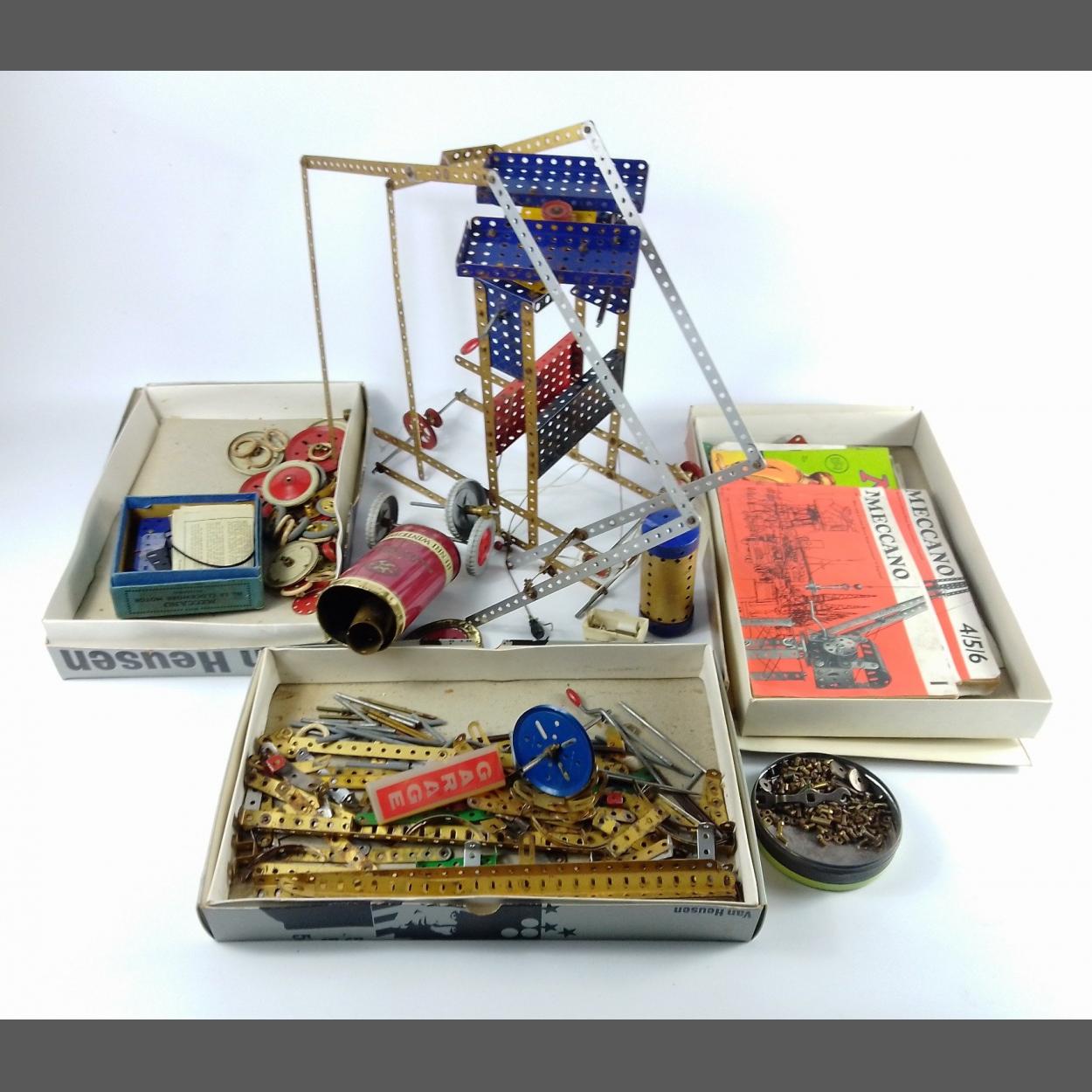 A quantity of MECCANO to include red, blue and yellow built as a crane, with lots of accessories including wheels and some instruction manuals mainly from the 1960s