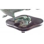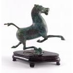 An accomplished modern representation of an ancient bronze horse standing on back of what appears to be a swallow in flight on a plinth which needs some repair. 20cm tall approx