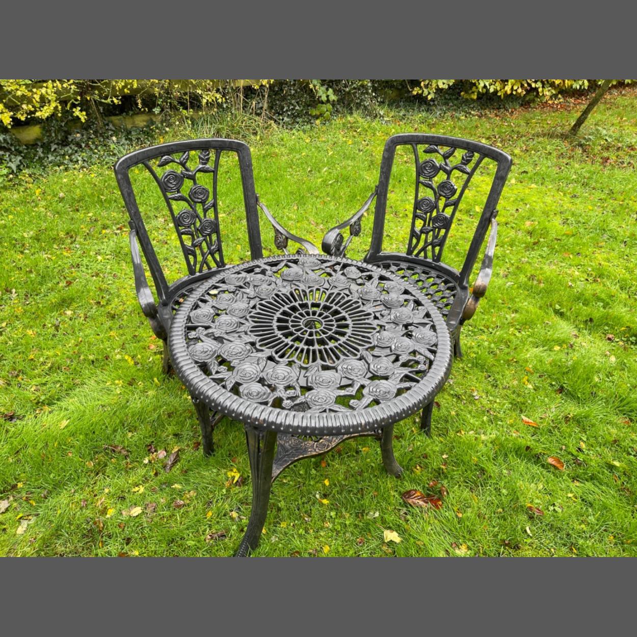 A wrought-iron style resin all weather garden table measuring 65cmHx69cmW with 2 chairs