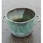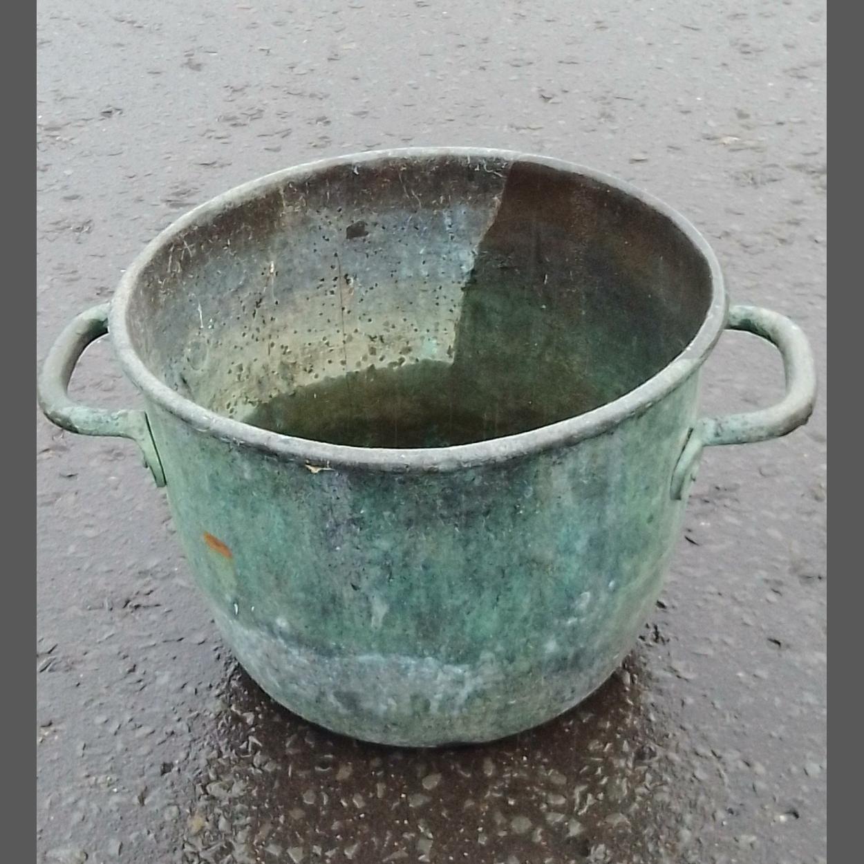 A large two-handled copper garden pot standing 24Hx31Wcm, possibly once a kitchen stock pot