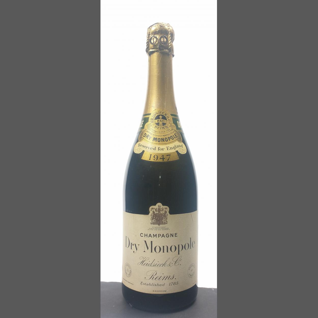 A DRY MONOPOLE CHAMPAGNE bottle, labelled 'reserved for England 1947' no quantity on label, bottle height 32cm approx