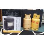 A bright red CALOR GAS lifestyle mini heatforce with 2 x 7kg flogas full bottles, only one year old and unused comes with instructions