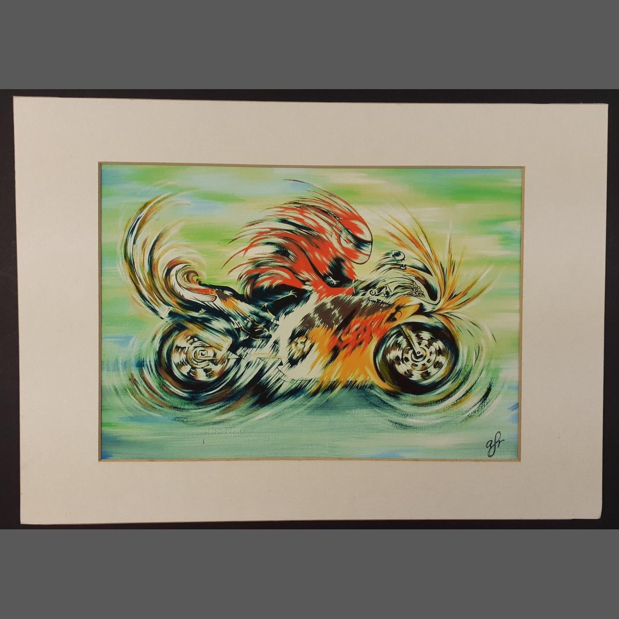 RARE! An original watercolour by ANNE-FRANCE RIX of a fast moving motorcycle, image size 28x20cm approx