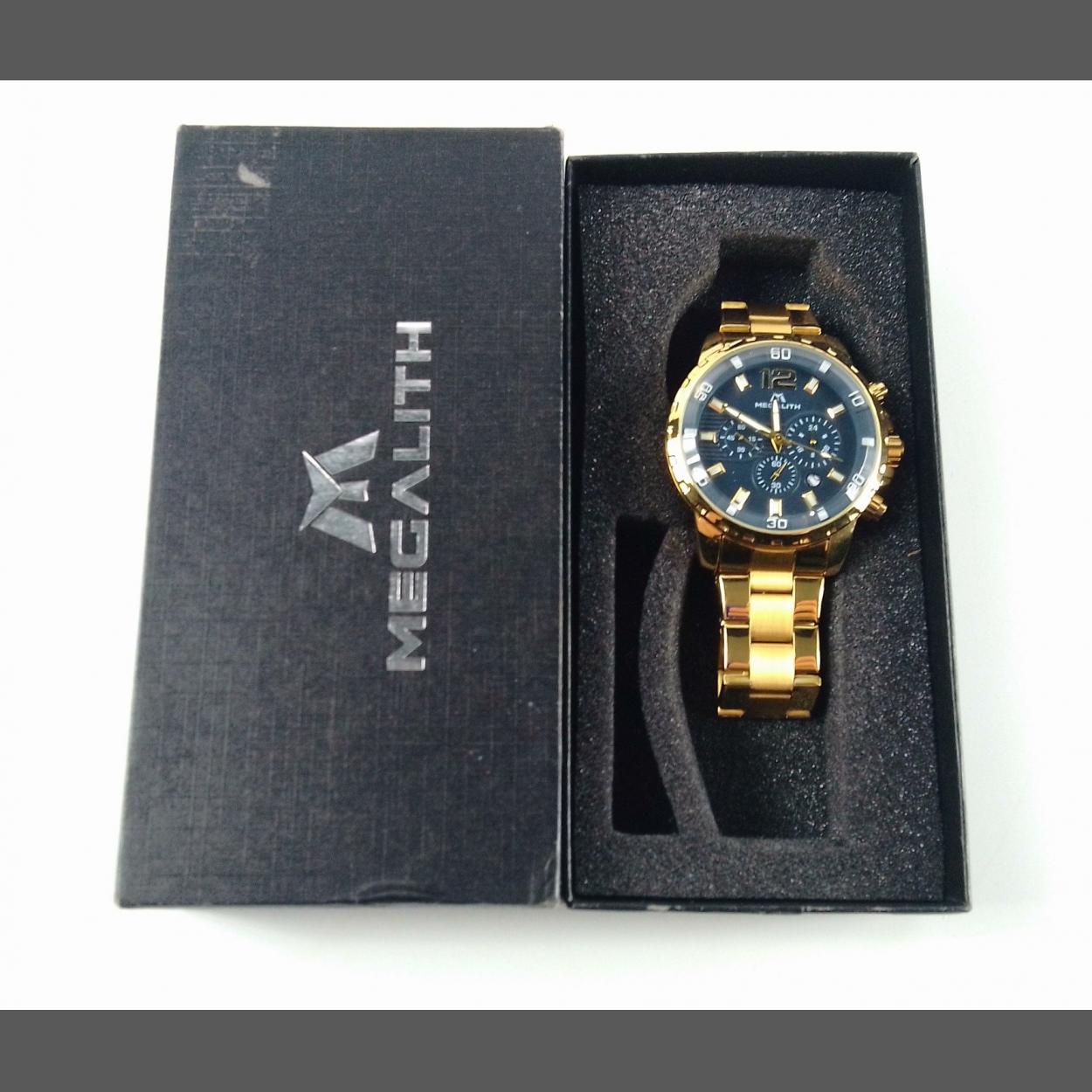 A large MEGALITH fashion watch chronometer style with huge dial, circa 40mm, in original box. Ticking away nicely at time of valuation
