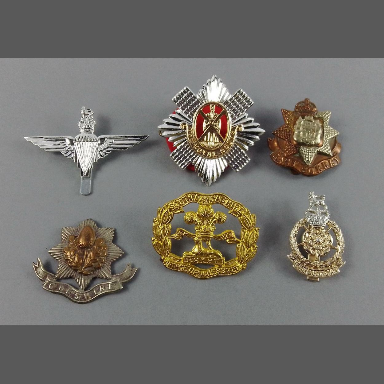 A collection of British military cap badges to include older King's Crown East Surrey, Cheshire without lugs and modern Staybrite badges