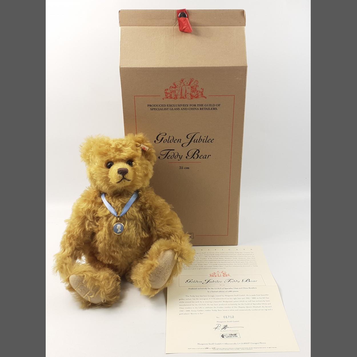 A STEIFF Golden Jubilee Bear with Wedgwood cameo of the queen necklace, reference 660610, stands 35cm high with mohair fur, number 01712 of a limited edition of 1500 produced in 2002 with certificate in original box