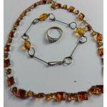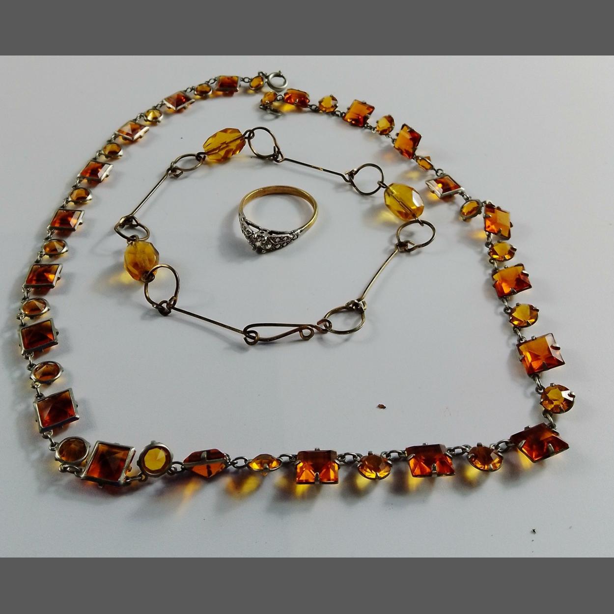 An unusual necklace with mounted square and circular set amber stones stamped 'Platinim'. With similar unmarked bracelet. Lot includes an FM marked yellow metal ring with marcasite shoulders and non diamond centre stone.