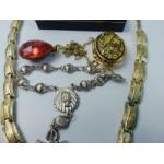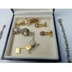 A mixed lot of costume jewellery to include unmarked yellow metal jewellery earrings, necklace, a large synthetic pink stone pendant, a small pill box etc