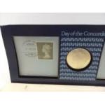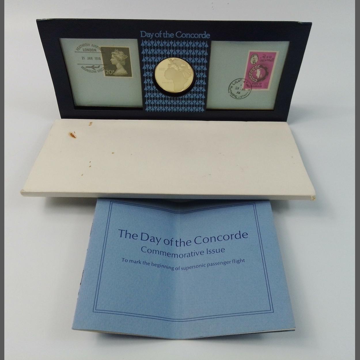 COLLECTIBLE! - DAY OF THE CONCORDE Commemorative medallion and stamp set 21st January 1976 within a presentation pack - first supersonic commercial flight Heathrow airport London to Bahrain - distance 3780 miles time completed 3hrs 38mins - also comes with the original commemorative booklet