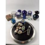 A mixed lot to include a substantial tabletop slate pot stand (30cm dia), 2 GRAY'S hand-painted pottery pots, a PRIORY glazed ceramic vase, paperweight, pottery, perfumes etc