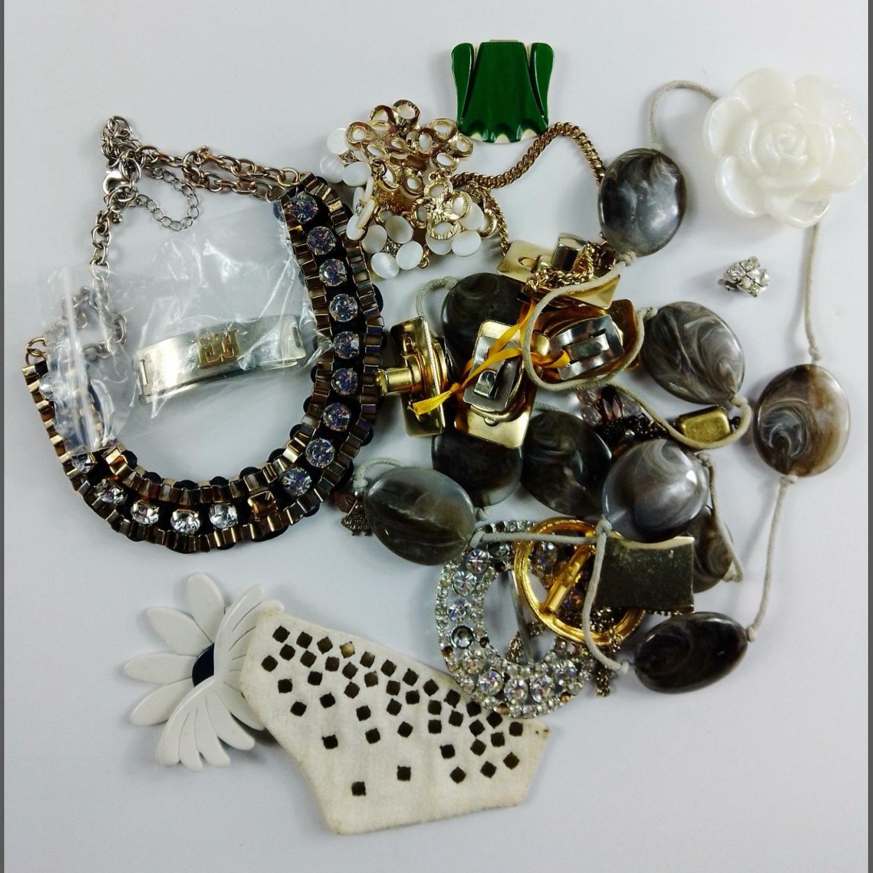A bag of pretty costume jewellery, rhinestone brooches, necklaces, cufflinks, etc