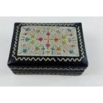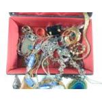 A nice leather clad jewellery box with a symmetrical decorative top STUFFED with jewellery to include an unmarked yellow metal bracelet, a nice GREEK KEY design white metal neck chain - unusual BOUTIQUE pendants etc