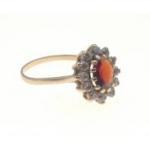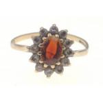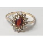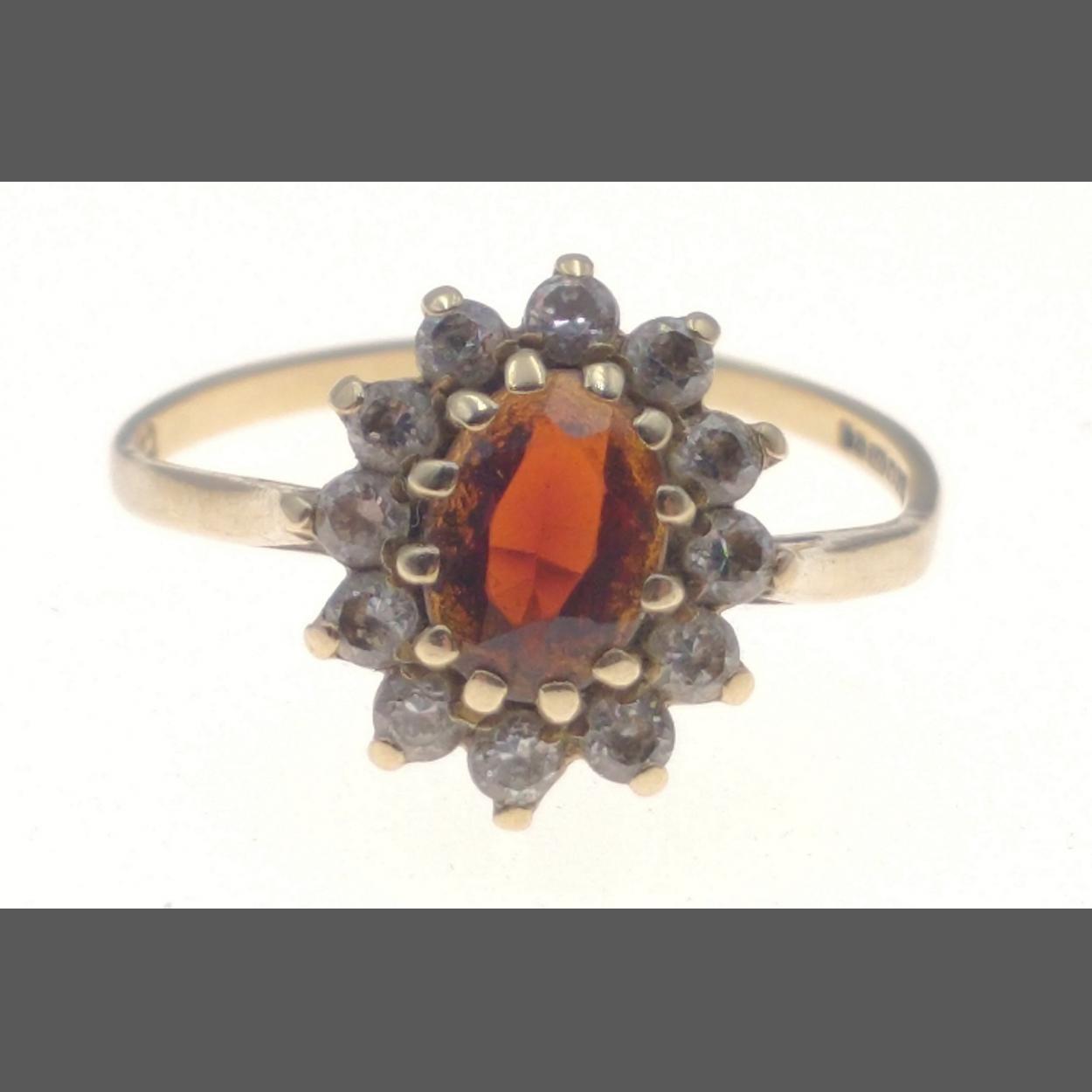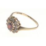 A very pretty 375 9ct gold hallmarked ring with a pretty red centre stone surrounded by white stones. Size P Gross weight 1.95g approx.