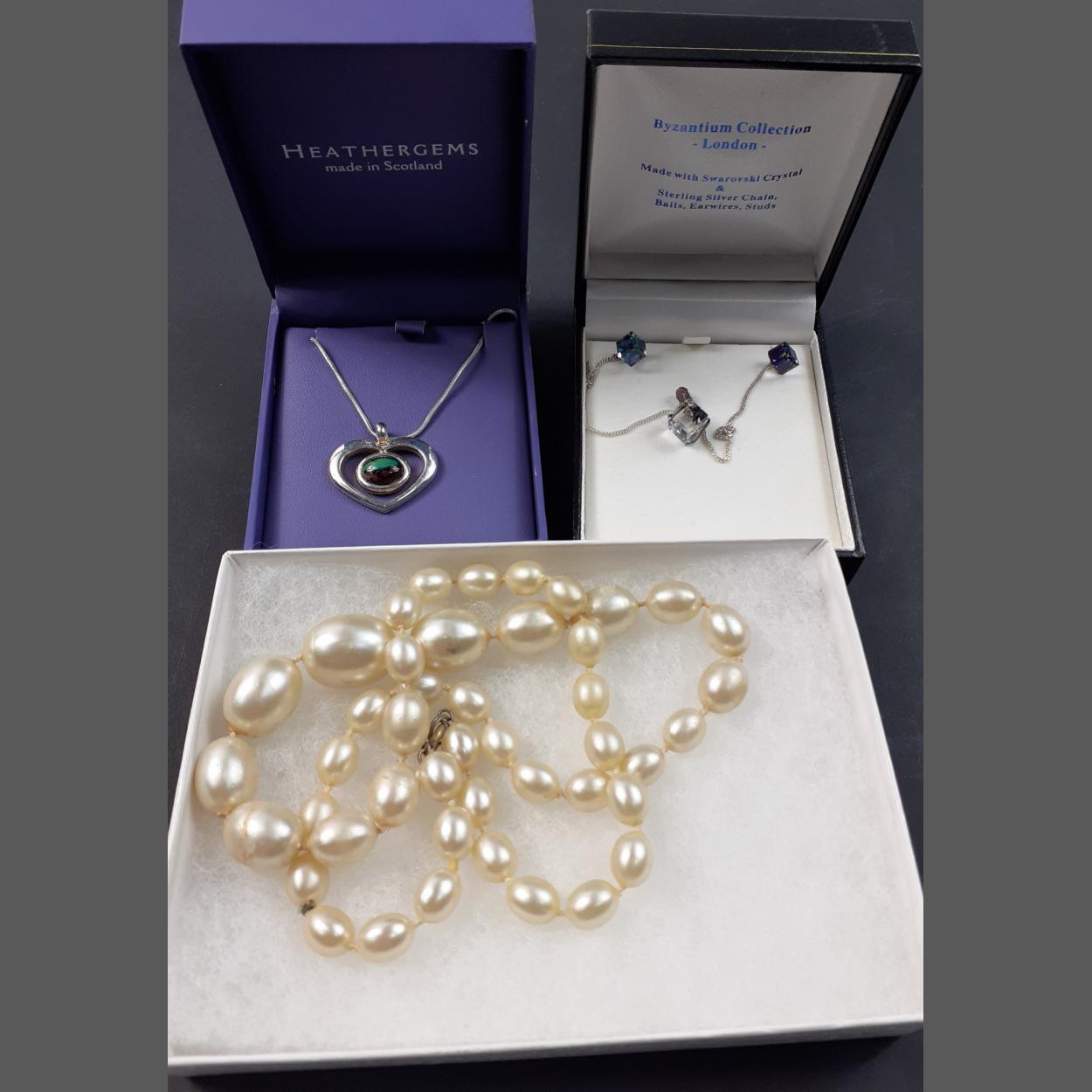 HEATHERGEMS a very pretty Scottish pendant in gift box. Also a string of faux pearls and BYZANTIUM COLLECTION 925 silver stamped chain with Swarovski crystal pendant and matching earrings. A very pretty ensemble.