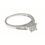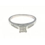 A 14K stamped white gold and diamond ring. A very attractive piece with four square diamonds making up the centre and fourteen small baguette cut diamonds on the shoulders. Makers stamp RJM. Size M Total gross weight 2.05g approx