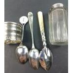 A super little silver collection of lovely objects of interest to include a monogrammed napkin ring dated 1941 by H.G & S weight 18.1g approx, an 1835 William IV spoon with 1892 inscription, a KINGUSSIE 1922 hallmarked souvenir spoon weight 13.08g approx and a silver lidded bottle 9cm hallmarked 1898. Also includes a silver mother of pearl hanled 13cm caddy spoon. A super little lot of quality pieces.