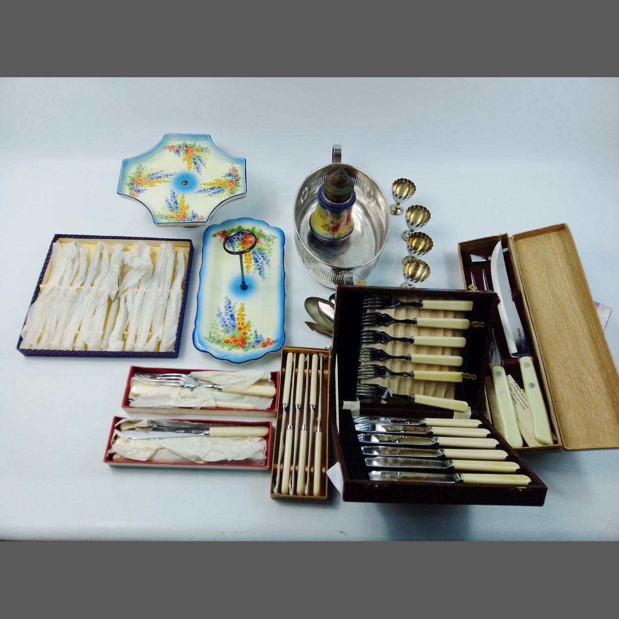 A super collection of great quality boxed flatware sets to include beautiful forks and spoons and boxes of apparently unused knives etc. Also some nice loose EPNS pieces and several Hanley ceramic serving pieces.