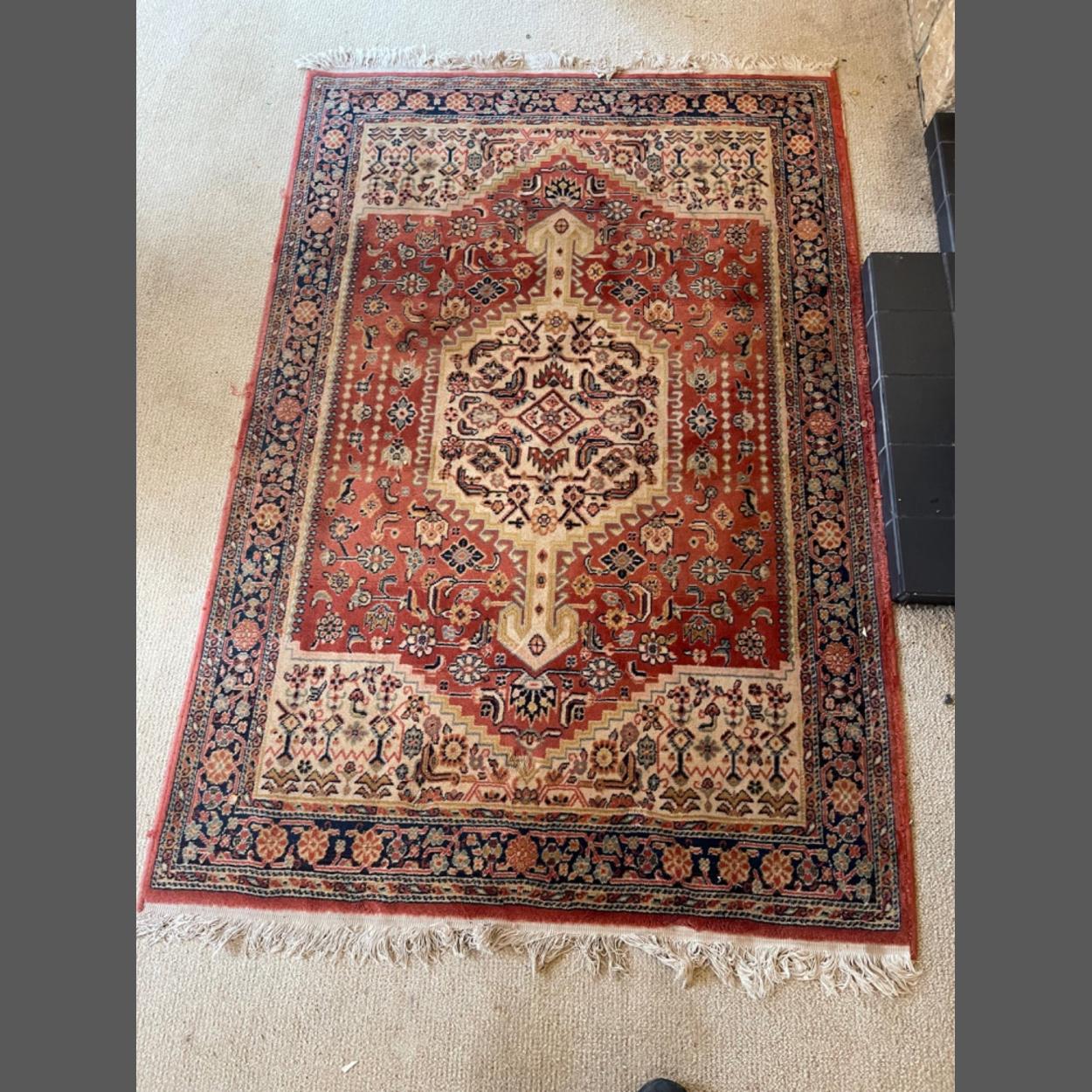 A 'PURE NEW WOOL patterened rug by POOLE 6ft x 4ft with red, orange, amber and cream tones