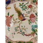 One large antique 40cm serving tray and 3 beautifully decorated gilt edged plates each 23cm dia with bird of paradise and floral design. One small crack noted and some crazing