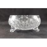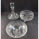 Three pieces of crystal to include a shallow EDINBURGH CRYSTAL footed bowl (23cm dia), a ship's decanter 26cm high, and a bowl on 3 feet 20cm dia (small chip from rim)