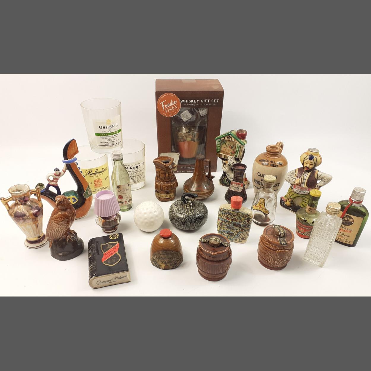 A box of novelty miniature whisky and liqueur bottles to include a Beneagles eagle, Beneagles curling stone, Curries Perthshire stoneware bottle and others