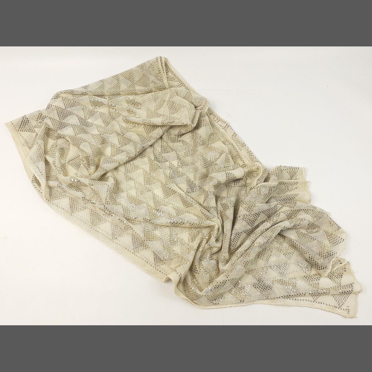 Revive that old style elegance with a 1920's Egyptian shawl lacy cream background with gilt pyramids, measuring 1.8m x 60cm approx one small hole and one small repair noted