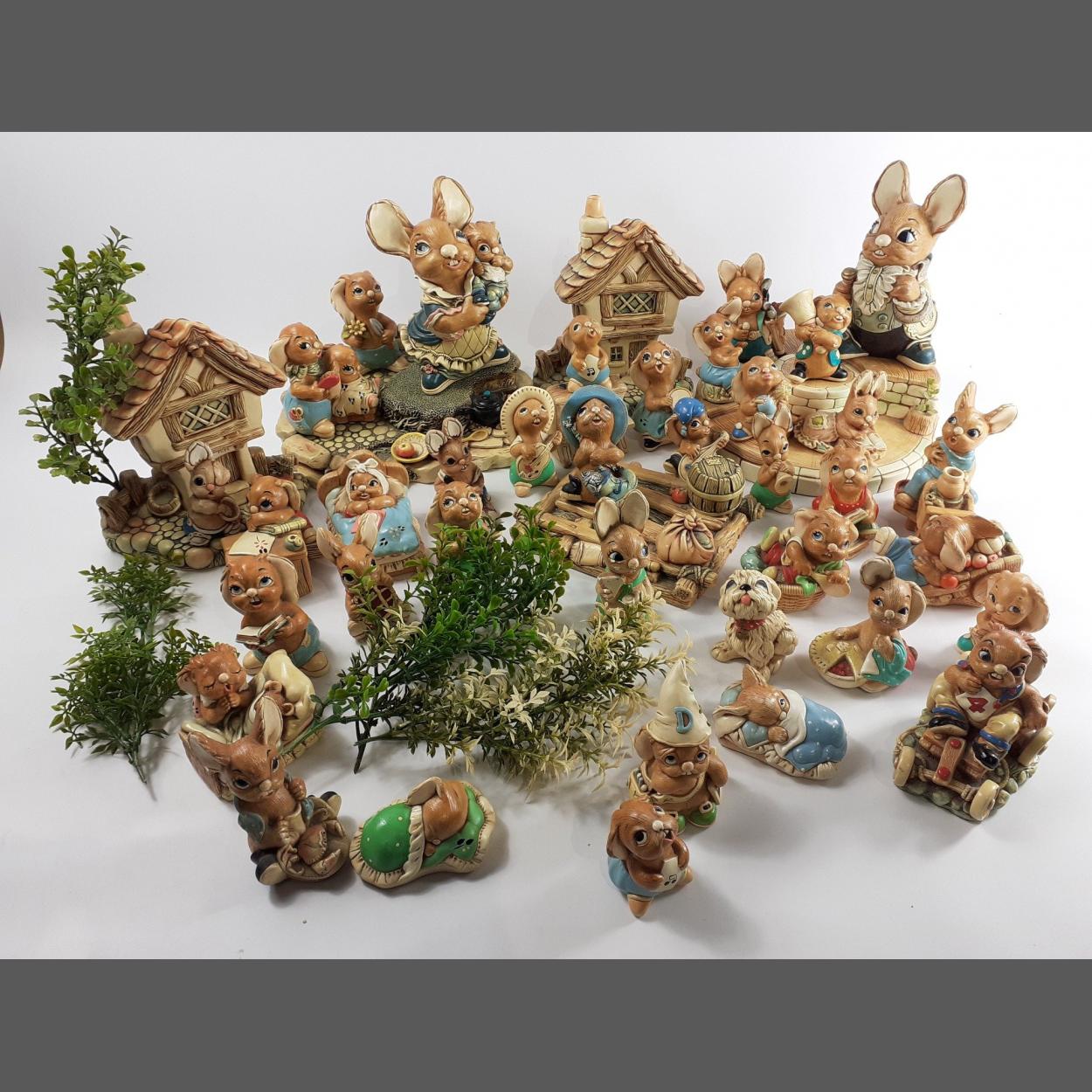 A collection of PENDELFIN BUNNIES with bespoke display stand to include Crocker, Birdie, Victoria, Father Rabbit, Rosa, Whopper, Rocky, Nipper, Peeps, Oliver, Muncher, Digit and many more,