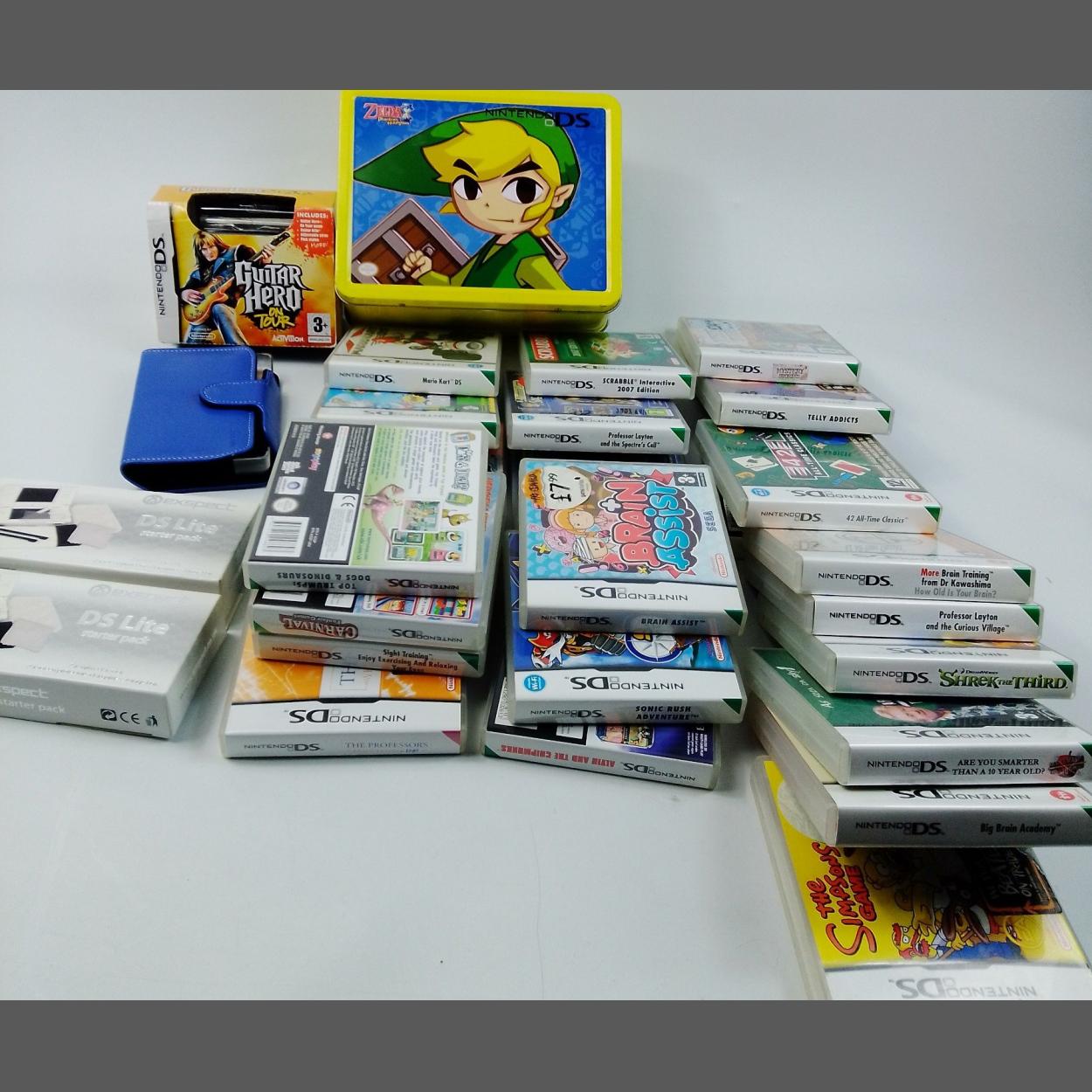 A small collection of nine NINTENDO DS games and DS holder to include Simpsons, Big Brain Academy, Are You Smarter than a 10 Year old, Top Trumps, Alvis and the Chipmunks, Sonic, Madagascar, Harry Potter Lego, Mystery Stories, Scrabble, Shrek the Third, Guitar Hero etc