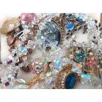 BLING JEWELLERY! - A small collection of eight brightly coloured stone effect brooches with a VINTAGE 'lengthy' crystal glass effect necklace
