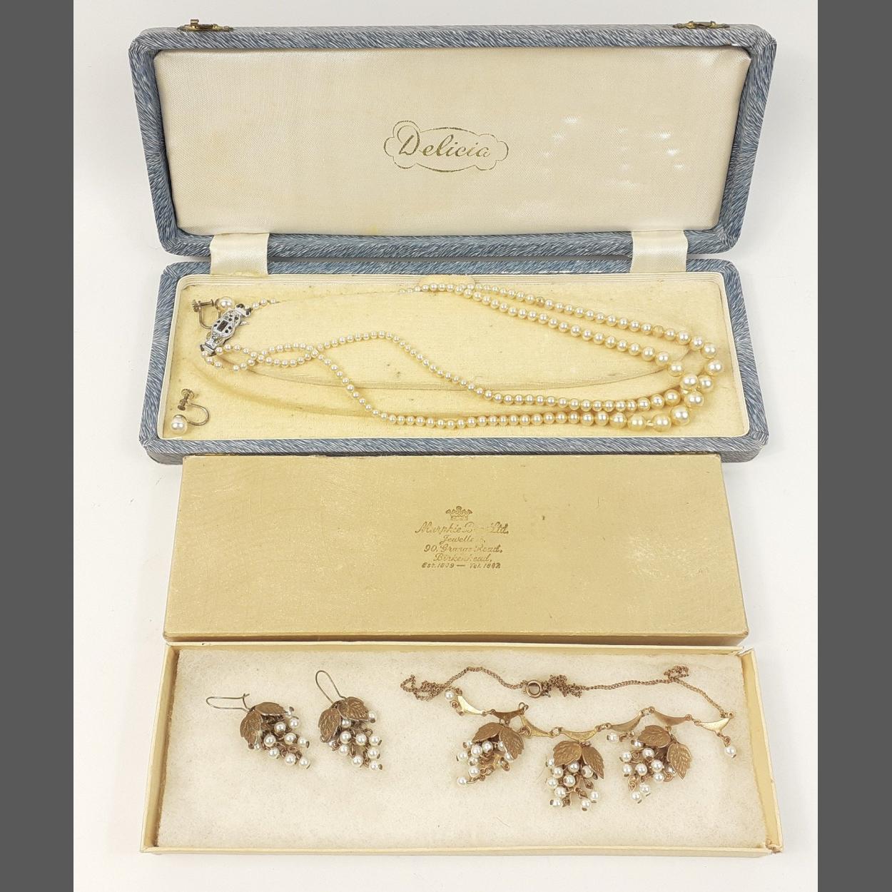 A costume DELICIA faux pearl necklace within its original jeweller's presentation case with a fine unmarked yellow metal and faux pearl PRETTY necklace with matching earrings