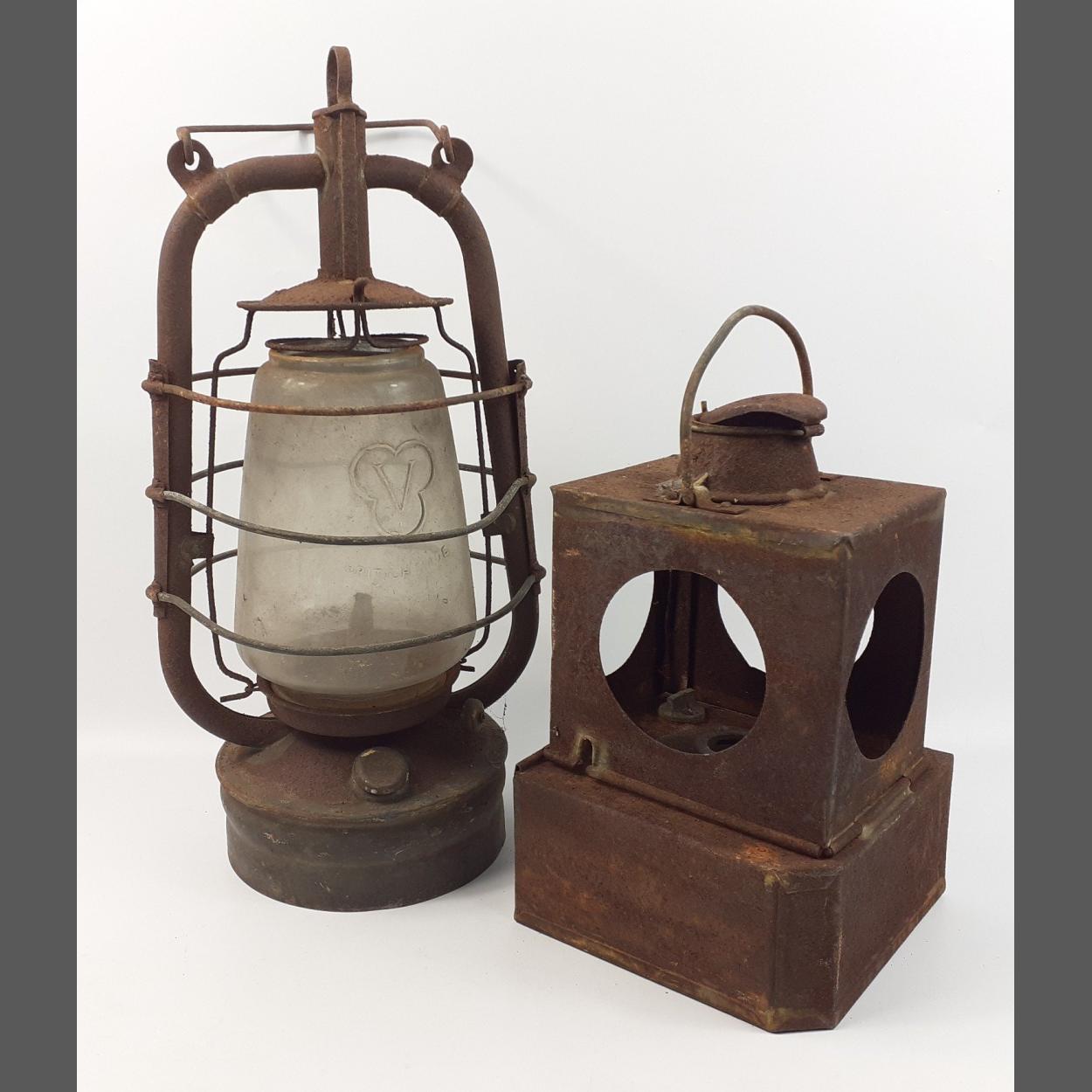 Two well-used railway lamps, 1 TOWER LITE, approx 40cm tall, the other with no discernible name, has been used for candles,16x29cm high approx