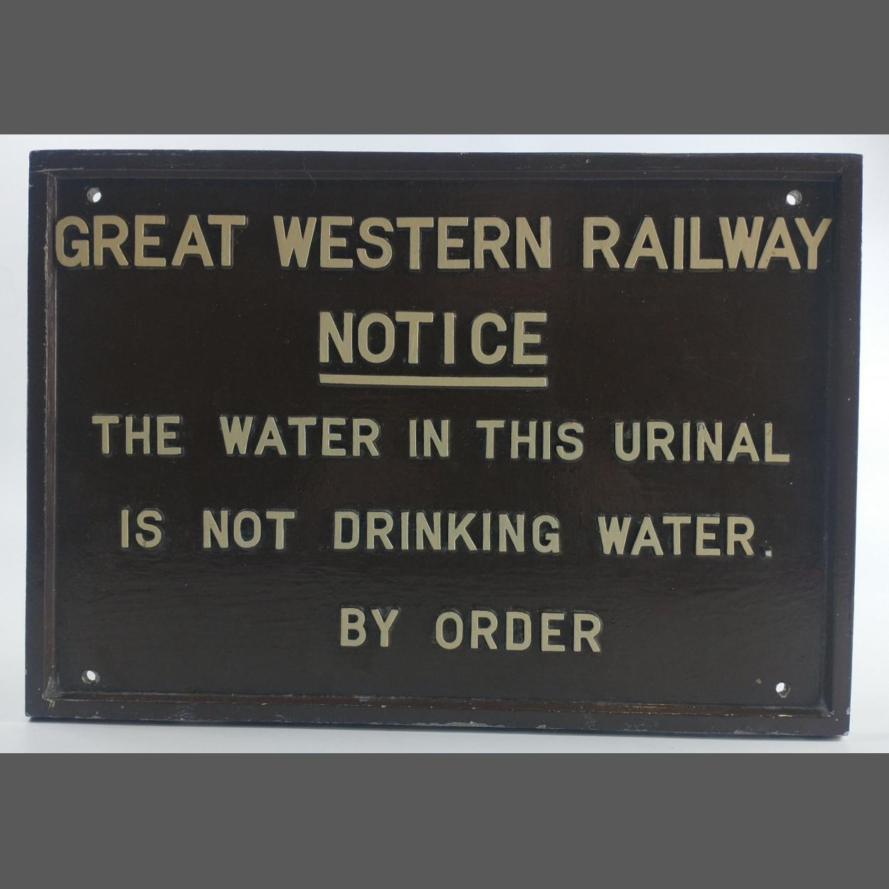 RAILWAY INTEREST! A VINTAGE GREAT WESTERN RAILWAY Notice sign ' The Water In This Urinal is not Drinking Water. - By Order! - sign possibly aluminium with 4 screw holes - dimensions 15" x 11" approx