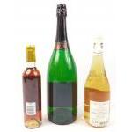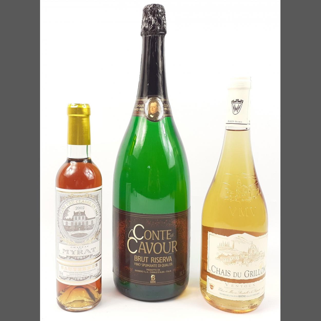 A 1.5 litre bottle of CONTE DI CAVOUR Brut Riserva 1988, a 75cl bottle of CHAIS DU GRILLON 2014, and a 375cl bottle of CHATEAU DE MYRAT Sauternes 2002