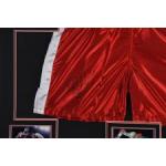 A very nicely framed pair of boxing shorts which FRANK BRUNO has personally signed. NOTE: This item will be supplied with a certificate of authenticity (FREE OF CHARGE). H: 88cm W: 109cm D: 3cm