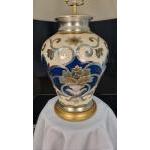 A porcelain blue and cream hand painted lamp with embossed detail. Display shade shown supplied free of charge. Condition very good and in full working order.. H: 78cm W: 50cm D: 50cm