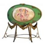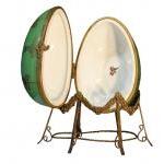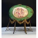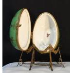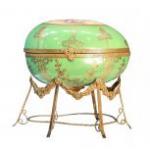 A painted porcelain egg on metal brass-coloured stand. H: 18cm W: 18cm D: 13cm
