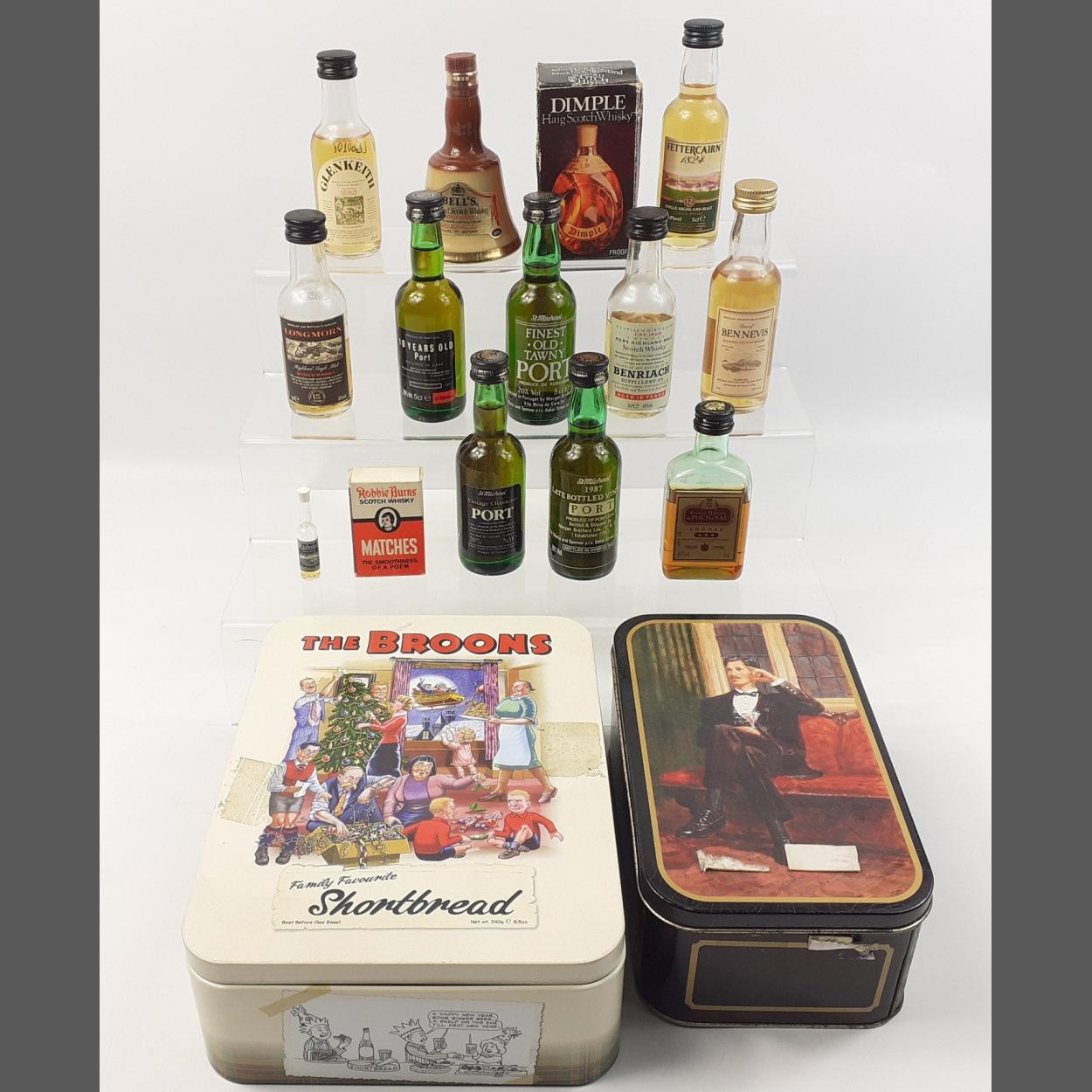 A small collection of miniatures to include a boxed ROBBIE BURNS Scotch Whisky Matches, FETTERCAIRN 1824, GLENKEITH, BEN NEVIS, boxed DIMPLE, a presentation tin with three bottles of M&S port (with sediment). The angels have been busy with some of these bottles but they all remain sealed.