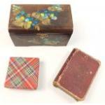 A pretty little jewellery case with a quantity of costume beads, a very pretty unmarked necklace with 5 aqua coloured stones and also a boxed Lexicon game