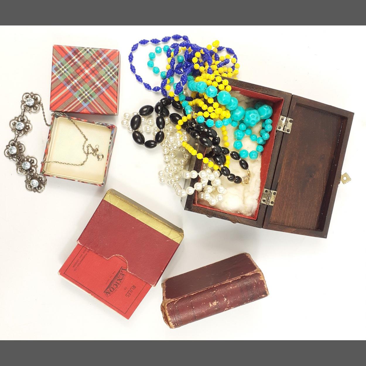 A pretty little jewellery case with a quantity of costume beads, a very pretty unmarked necklace with 5 aqua coloured stones and also a boxed Lexicon game