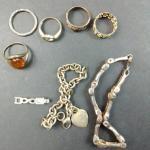 A silver collection to include an articulated bracelet stamped 925, 20cm approx, a chain bracelet with heart medallion stamped 925, 17cm approx, 4 rings, two with stone, gross weight 51.00g approx plus one other ring